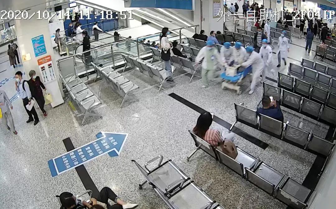 据悉,视频画面中在推车上为病人实施心肺复苏的医生是安医大一附院护理部的护师程旭。而当天,也恰好是她的28岁生日,在争分夺秒的抢救中,程旭度过了一个分外紧张而非凡的生日,事后程旭称这个生日特别有意义。图为女子倒地停止呼吸。