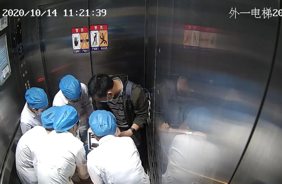 10月14日下午,安徽合肥一段医护人员跪在推床上抢救患者的视频刷爆朋友圈。当日中午,安医一附院一女子在候诊区中出现心跳停止,一名护师立即对其实施心肺复苏。在几名医护人员将女子送抢救室时,这名护师跪在推床上,继续对她实施心肺复苏。从女子停止心跳到进电梯和过道,十分钟一刻也没有停息。经过抢救,女子恢复了心跳和意识。图为在电梯里抢救。