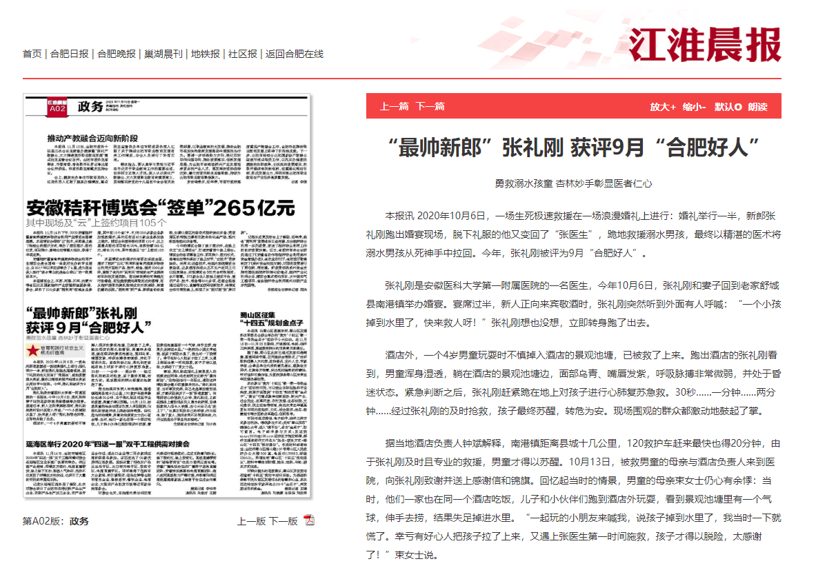 本报讯 2020年10月6日,一场生死极速救援在一场浪漫婚礼上进行:婚礼举行一半,新郎张礼刚跑出婚宴现场,脱下礼服的他又变回了“张医生”,跪地救援溺水男孩,最终以精湛的医术将溺水男孩从死神手中拉回。今年,张礼刚被评为9月“合肥好人”。