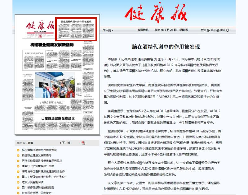 健康报、光明网、科技日报、人民在线:脑在酒精代谢中的作用被发现