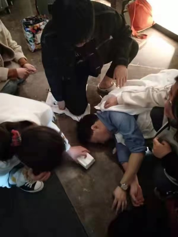 “我们当时同在一部电梯,他毫无征兆地倒在地上,现场的人都很慌张。”同学们回忆起当时的情形,仍觉得十分紧急。“邱健与吴钰首先将倒地男子转移出电梯、进行简单查体后将患者头偏向一边,趁患者还有意识时询问倒地男子既往病史。曹柳柳与汪文昕及时清理患者口鼻分泌物确保气道畅通、解开患者上衣扣子及腰带、同时查看四肢感觉。王妍从酒店拿来毛巾用于保暖并拨打120急救电话。”