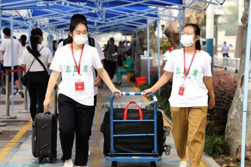 新生到校后,身穿统一服装、佩戴红色胸牌的志愿者们在北门、图书馆门口、青年志愿者岗亭等处提供托运行李、报到指导、问题解答等服务。