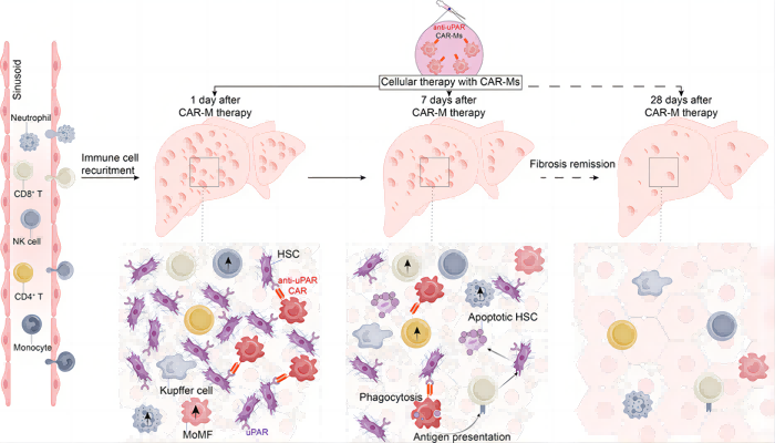 在肝脏中,巨噬细胞能够调控肝脏免疫微环境,这使它们成为治疗肝病的潜在效应细胞。鉴于巨噬细胞独特的效应功能以及巨噬细胞归巢肝脏的能力,对巨噬细胞进行基因工程改造在肝病治疗中具有巨大潜力。该团队在纤维化/肝硬化的患者和小鼠肝纤维化模型中证实CAR-Ms治疗显著改善了小鼠肝纤维化,并提高了肝功能。该研究结果证明靶向uPAR的CAR-Ms可以减轻肝纤维化和肝硬化。发现表达CAR-Ms在发挥直接的抗纤维化作用的同时,调节了肝脏免疫微环境,招募和改变了内源性免疫细胞的活化,并引发特异性的抗纤维化T细胞反应,从而推动纤维化的逆转。